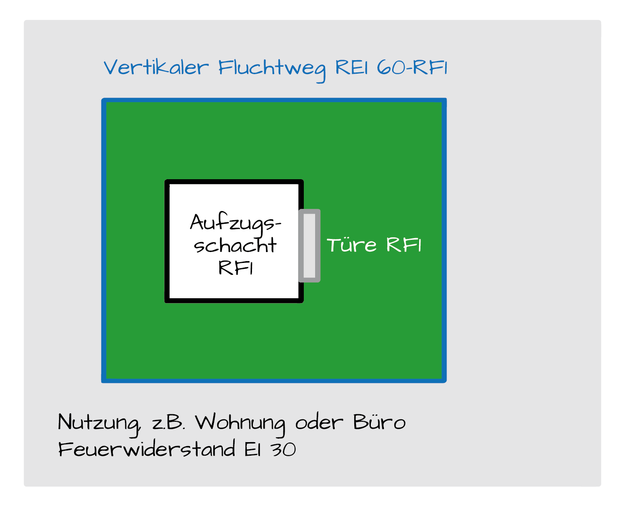 - Der Aufzug muss in einem Schacht installiert werden, der den gleichen Feuerwiderstand aufweist wie in der Nutzung für die Brandabschnittsbildung gefordert ist, mindestens jedoch EI 30.