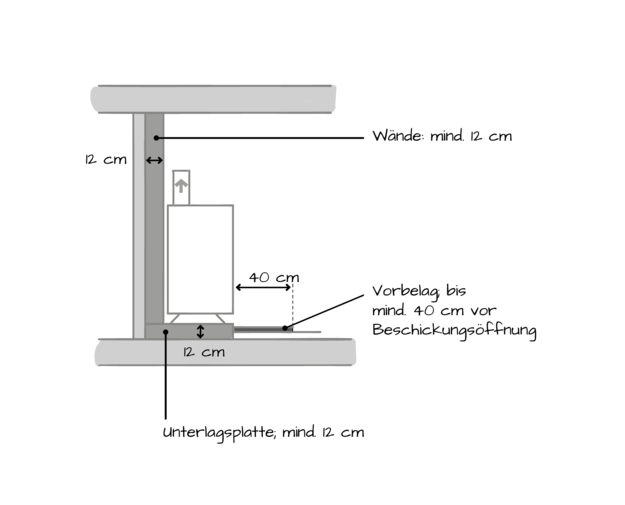 Unterlagsplatte: mindestens 12 cm dick , z. B. aus Stein, Beton oder gleichwertigem dauerwärmebeständigem Material aus Baustoffen der Kategorie RF1